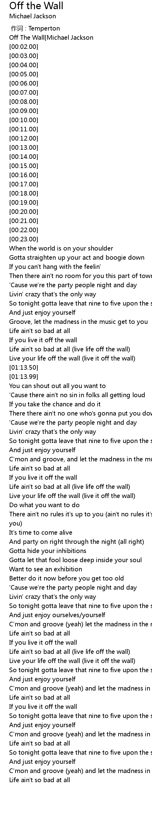 | [01:13.00] | Live your life off the wall live it off the wall |