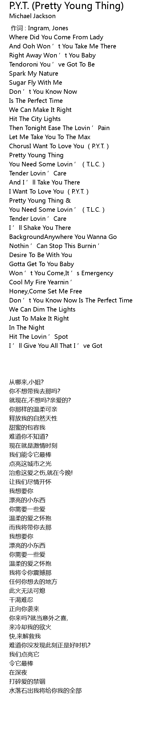 | [00:43.860] | ChorusI Want To Love You P. Y. T. |