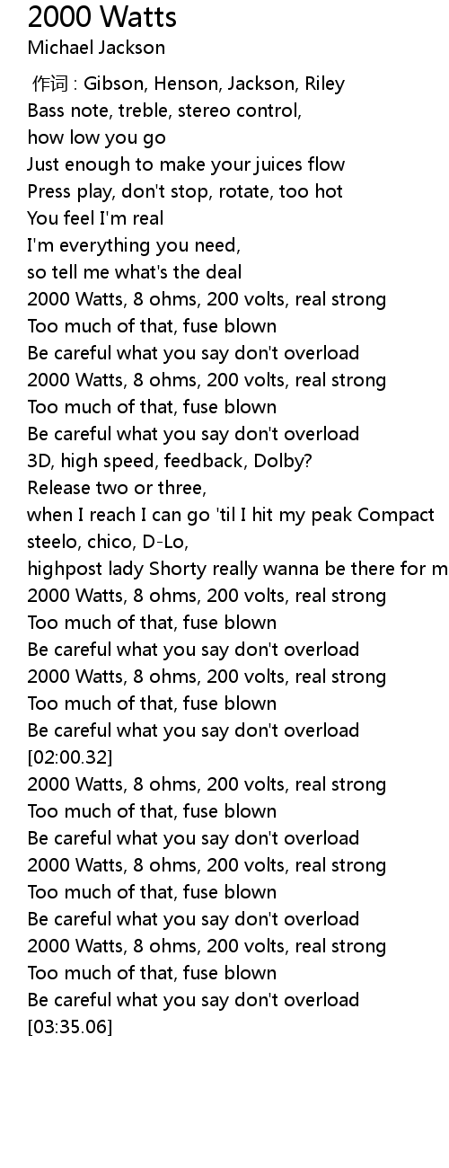 | [01:03.93] | 2000 Watts, 8 ohms, 200 volts, real strong |
