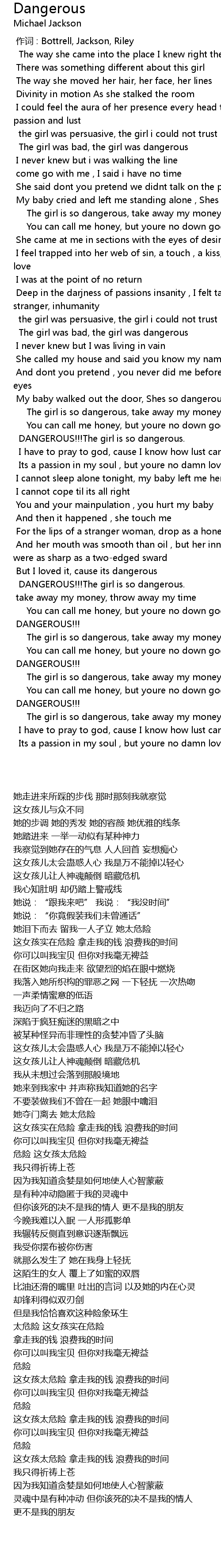| [01:42.920] | My baby cried and left me standing alone , Shes so dangerous. |