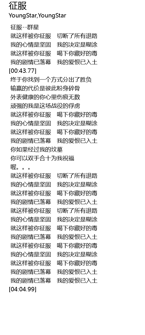 | [03:23.92] | 就这样被你征服 喝下你藏好的毒 |
