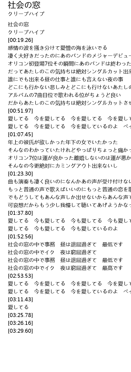 | [02:24.65] | 社会の窓の中で事務 昼は退屈過ぎて 最低です |