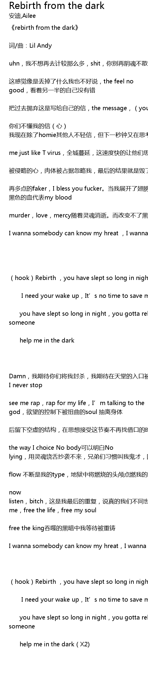 | (hook)Rebirth ,you have slept so long in night,you gotta rebirth | |