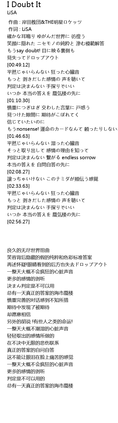 | [00:40.17] | もうsay doubt! 目に映る裏側も 見失ってドロップアウト |