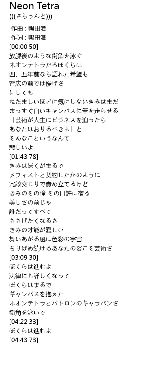 | [00:39.97] | ネオンテトラだろぼくらは |