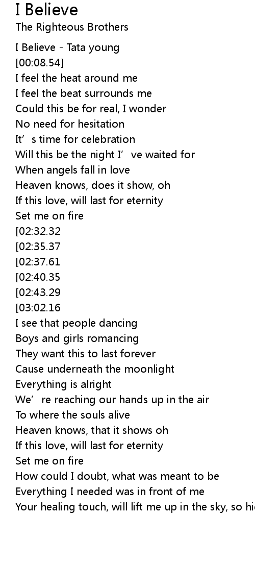 | [03:06.18][03:02.16][02:46.03][01:57.08][01:04.10] | Oh I believe, I believe |