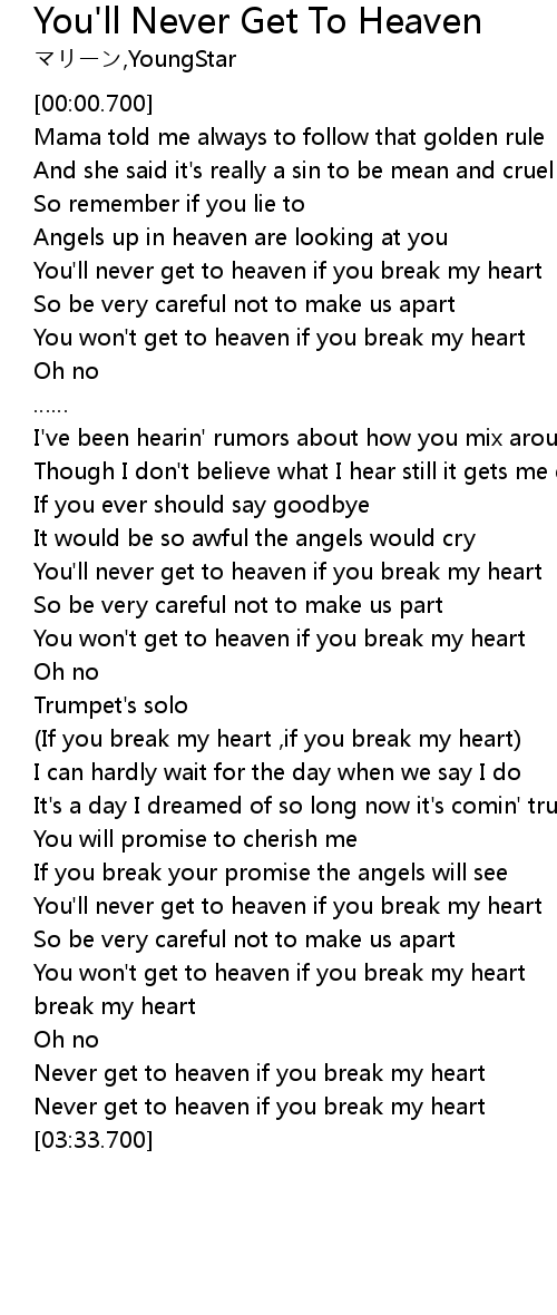 | [01:03.100] | You won't get to heaven if you break my heart |