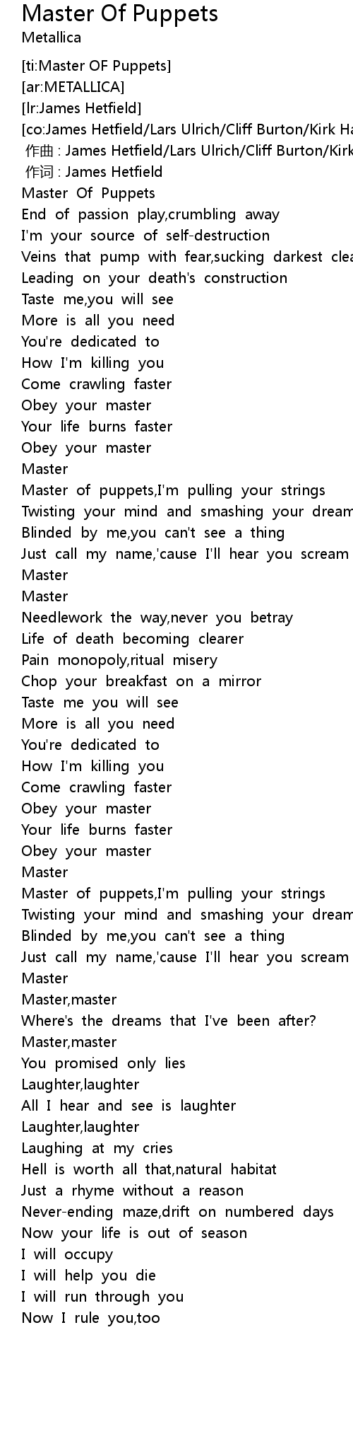 | [01:47.544] | Master of puppets, I' m pulling your strings |