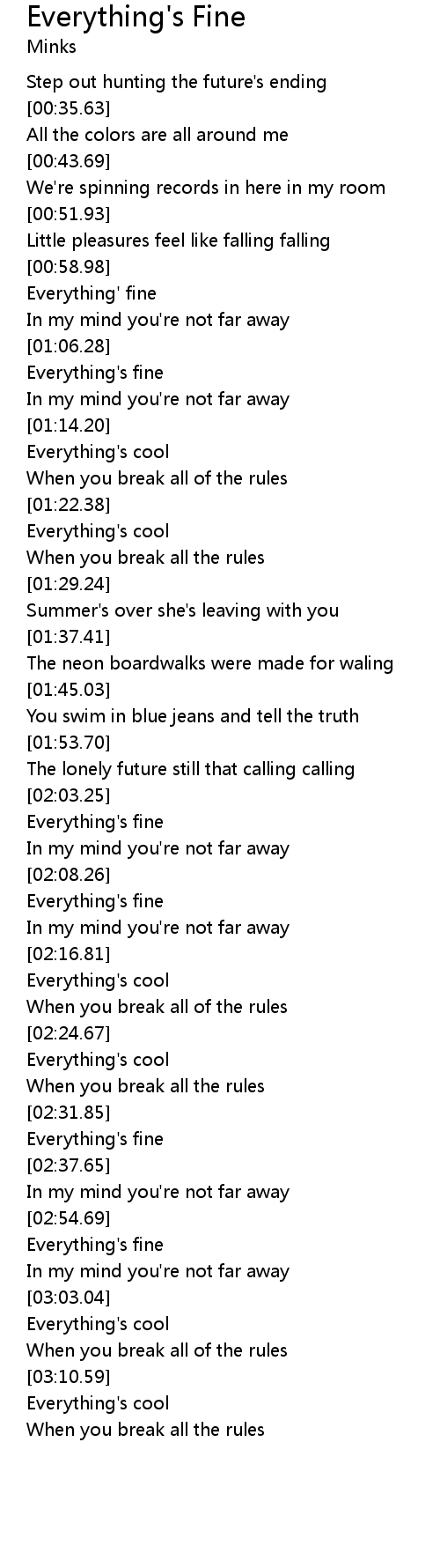 | [01:00.23] | Everything' fine |