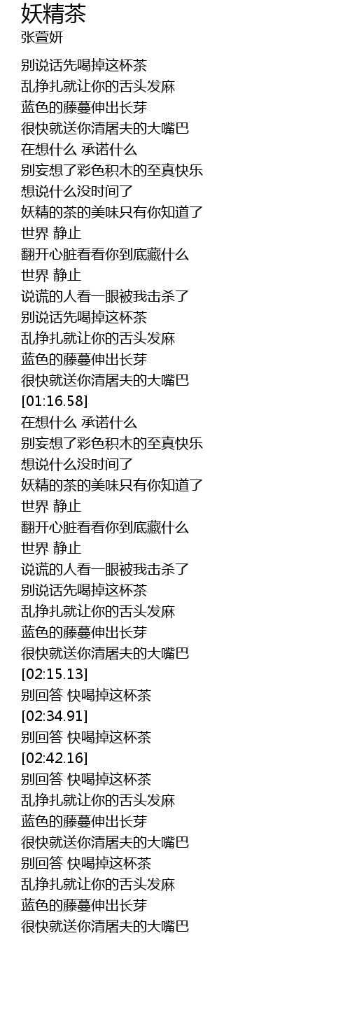 | [02:59.91] | 别回答 快喝掉这杯茶 |