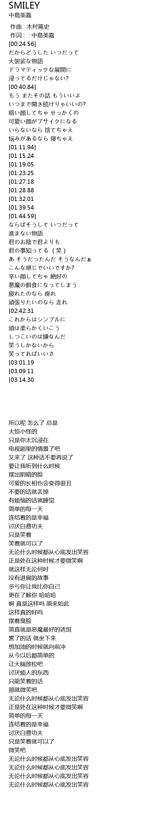 | [04:05.98][03:01.19] | どんな時も心の底からスマイリー |