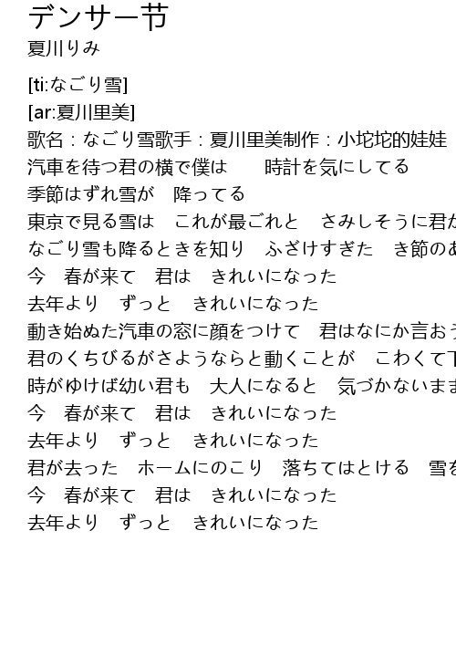 | [00:01.41] | 歌名:なごり雪歌手:夏川里美制作:小坨坨的娃娃 |