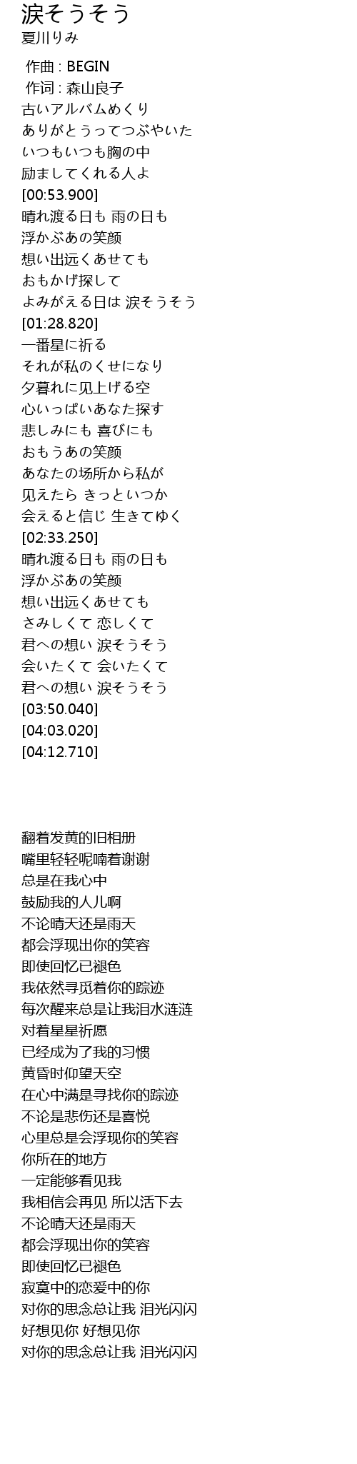 | [03:40.630] | 君への想い 涙そうそう |