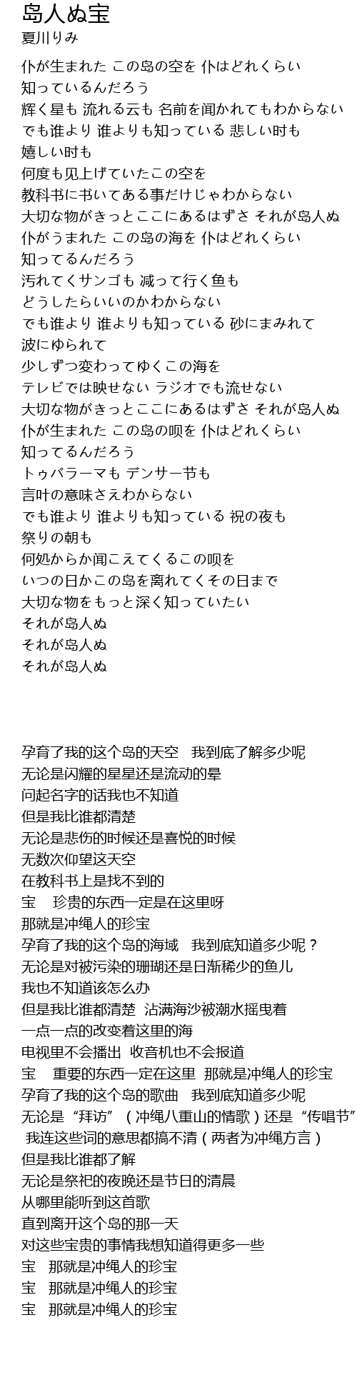 | [03:22.000] | 仆が生まれた この岛の呗を 仆はどれくらい 知ってるんだろう |