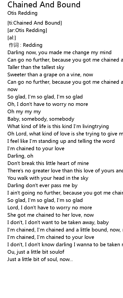 | [02:02.33] | I' m chained, I' m chained and a little bound, now, now, now |