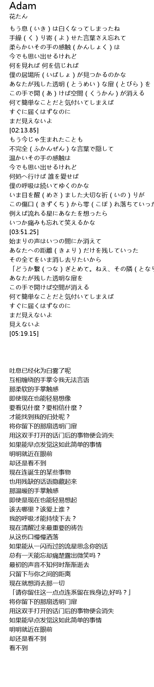 | [04:33.20] | 「どうか繋(つな)ぎとめて。ねえ、その隣(となり)に。」 |