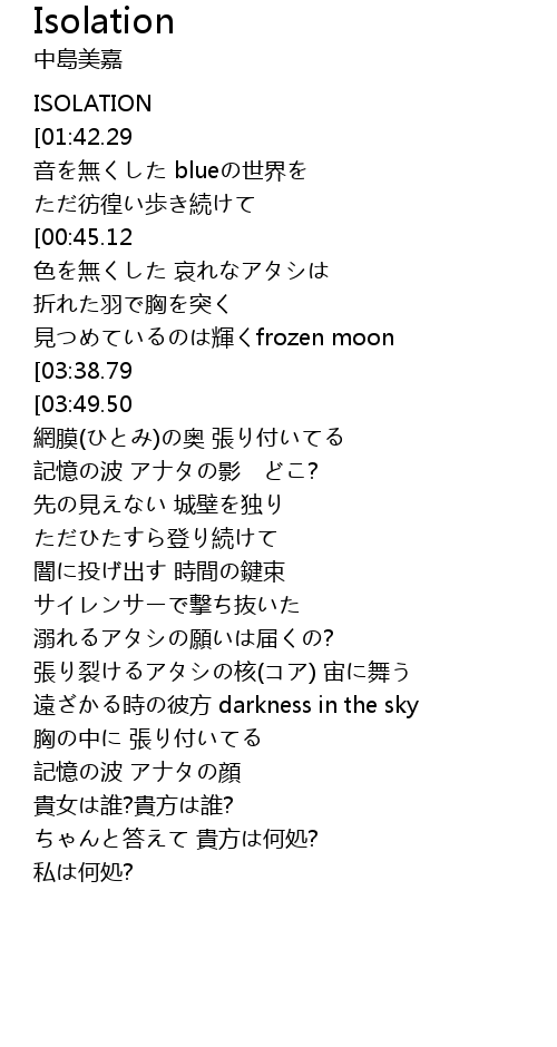 | [00:46.24][03:38.79] | 砕け散る優しい手で この躰 |