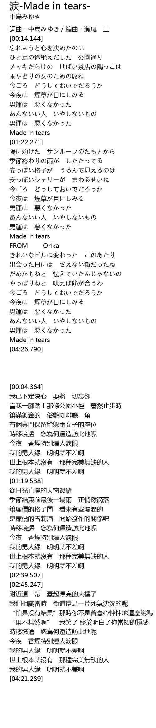 | [00:04.364] | 詞曲:中島みゆき/編曲:瀬尾一三 |