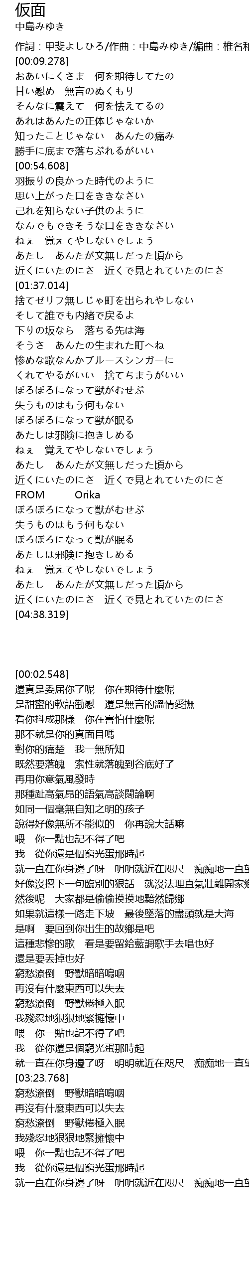 | [00:02.548] | 作詞:甲斐よしひろ/作曲:中島みゆき/編曲:椎名和夫 |