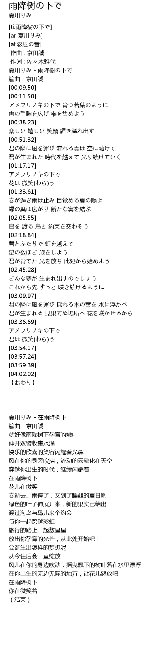 | [00:00.00] | 夏川りみ - 雨降樹の下で |