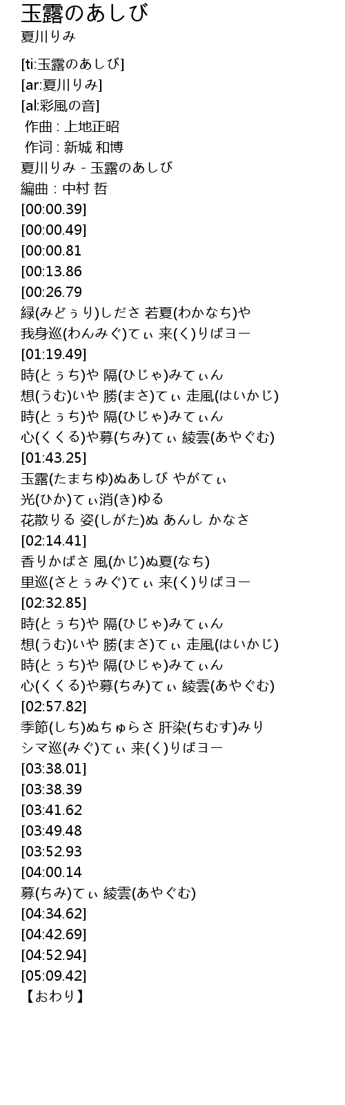 | [00:00.00] | 夏川りみ - 玉露のあしび |