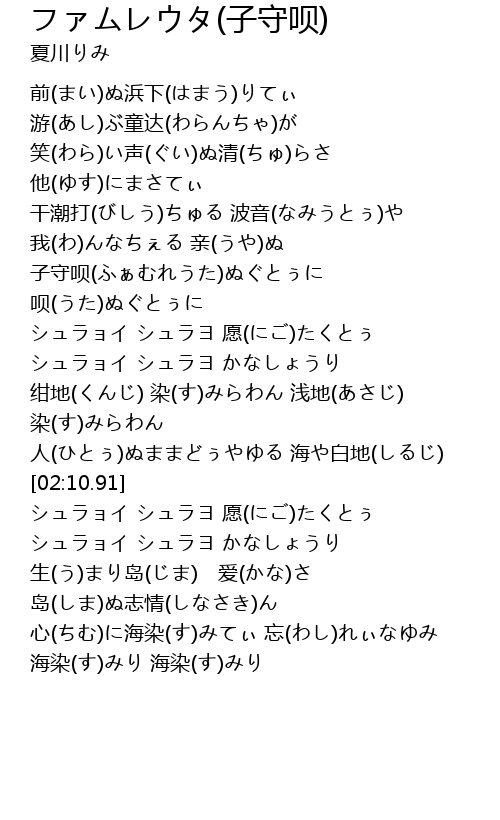 | [00:59.51] | 子守呗(ふぁむれうた)ぬぐとぅに 呗(うた)ぬぐとぅに |
