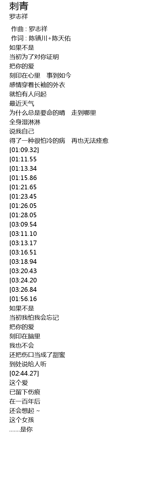 | [03:49.56][03:20.43][01:45.95] | 有一个你的刺青 |