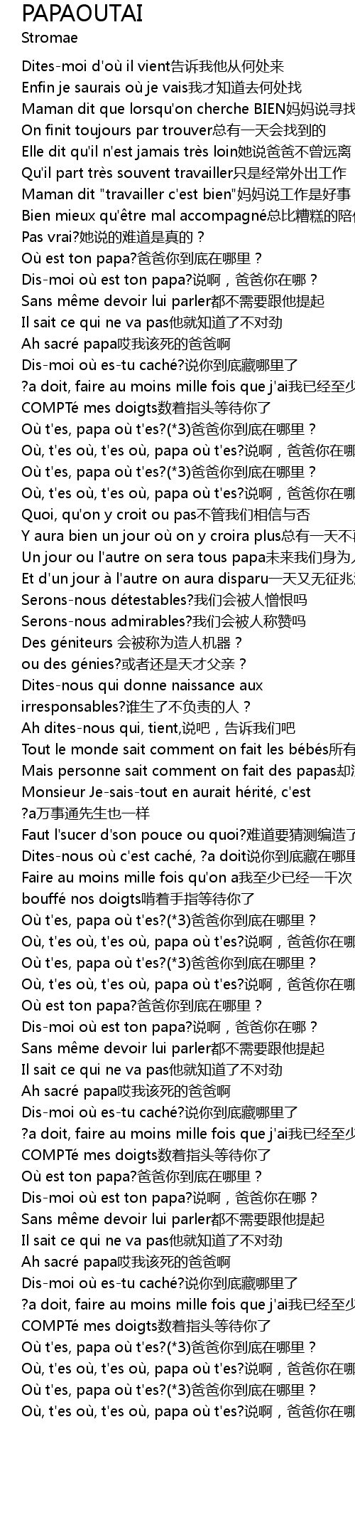 | [03:14.85] | Où, t' es où, t' es où, papa où t' es? shuō a, bà bà nǐ zài nǎ? |