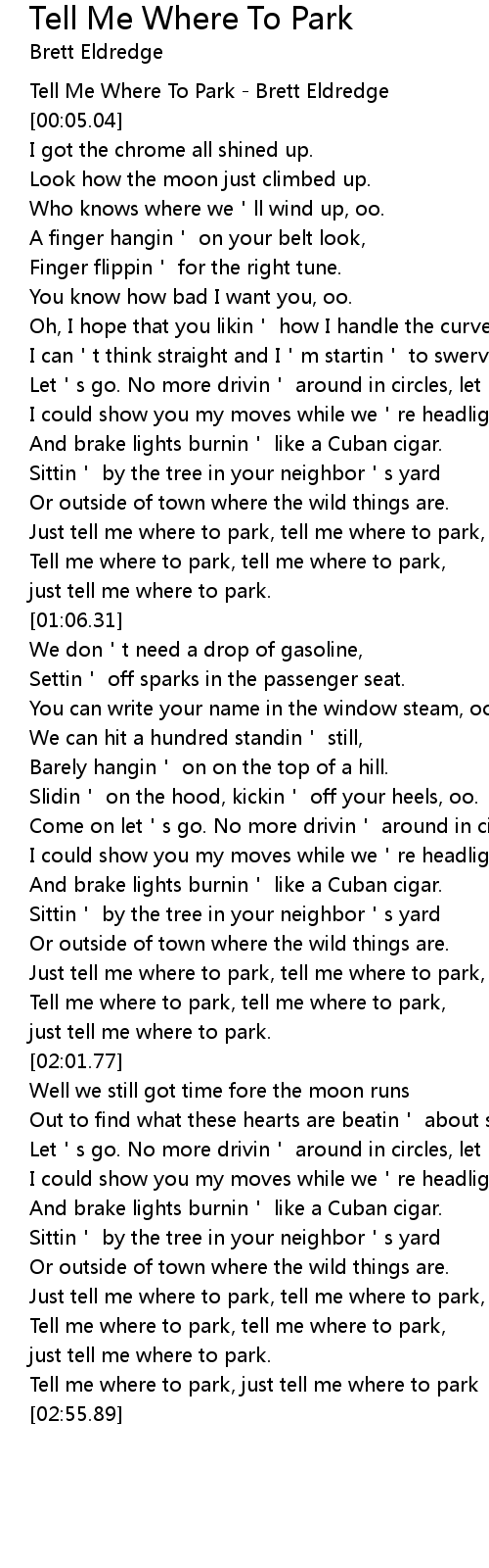 | [00:00.00] | Tell Me Where To Park - Brett Eldredge |