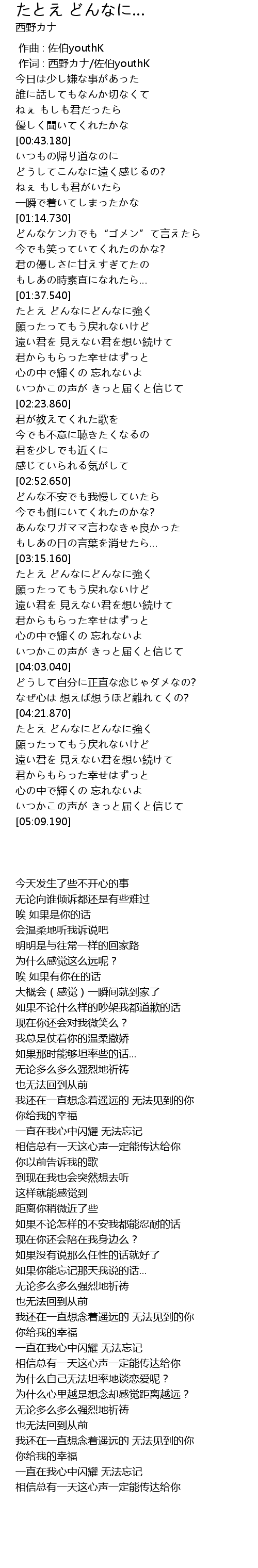 | [00:01.00] | 作词 : 西野カナ/佐伯youthK |