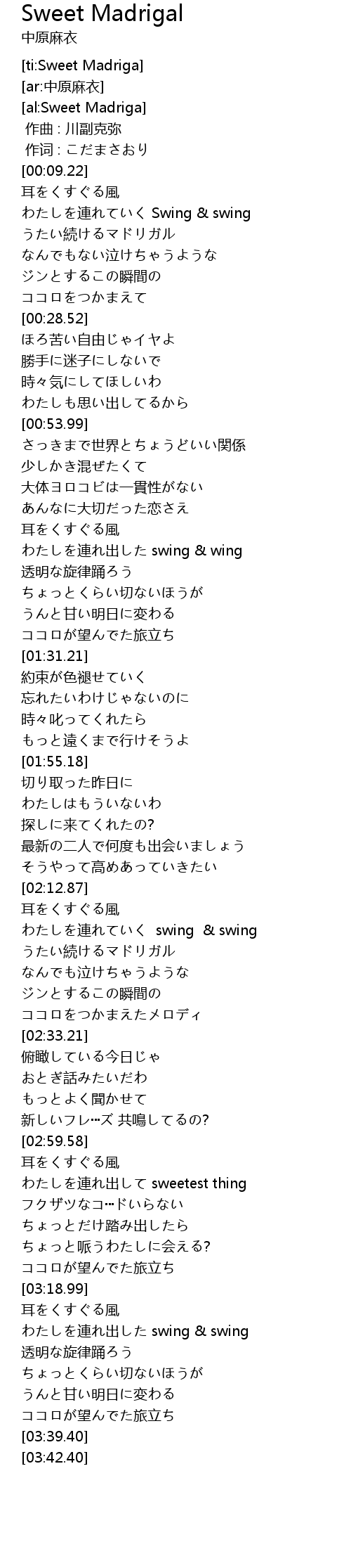 | [03:21.80] | わたしを連れ出した swing & swing |