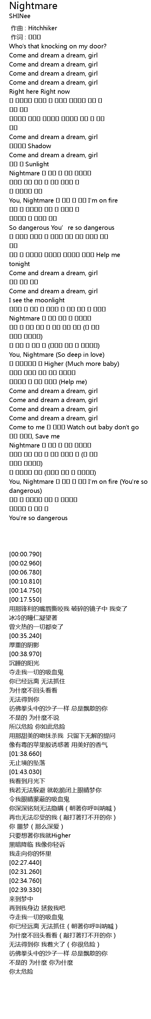| [03:18.980] | You, Nightmare 널 가질 수 없는 I'm on fire (You're so dangerous) |