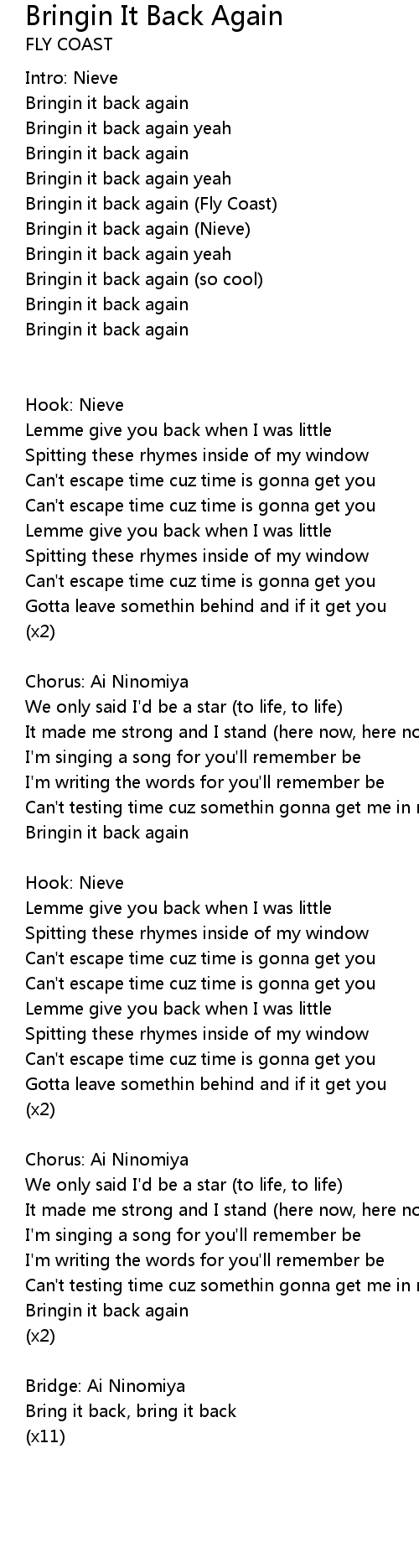 | Bringin it back again (Fly Coast) | |