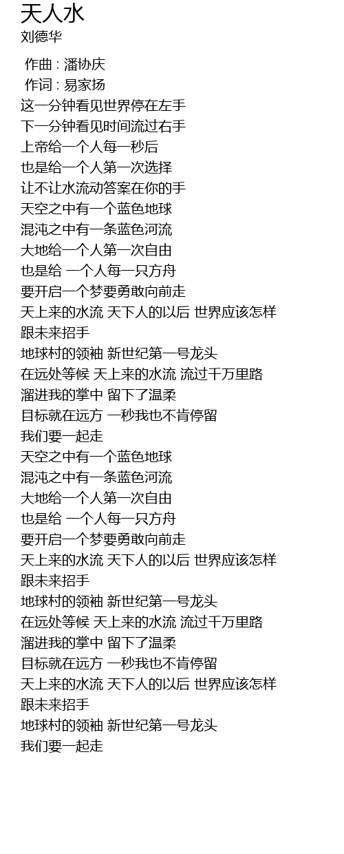 | [02:50.599] | 天上来的水流 天下人的以后 世界应该怎样 跟未来招手 |