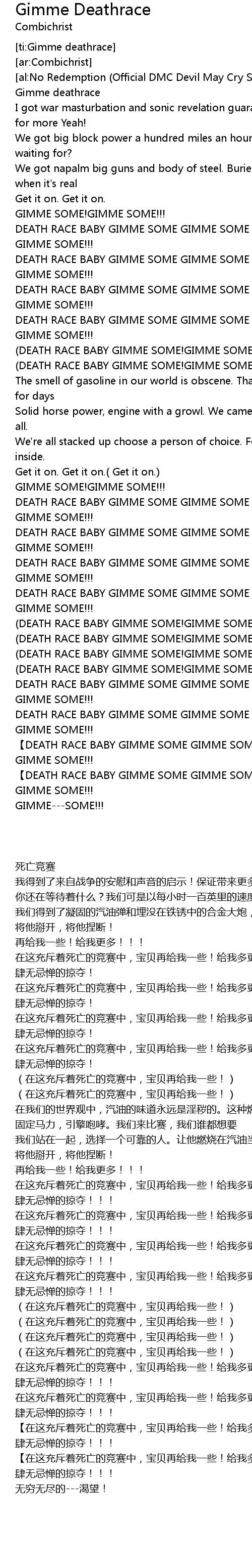 | [03:31.23] | 【DEATH RACE BABY GIMME SOME GIMME SOME MORE! GIMME SOME MORE!】 |