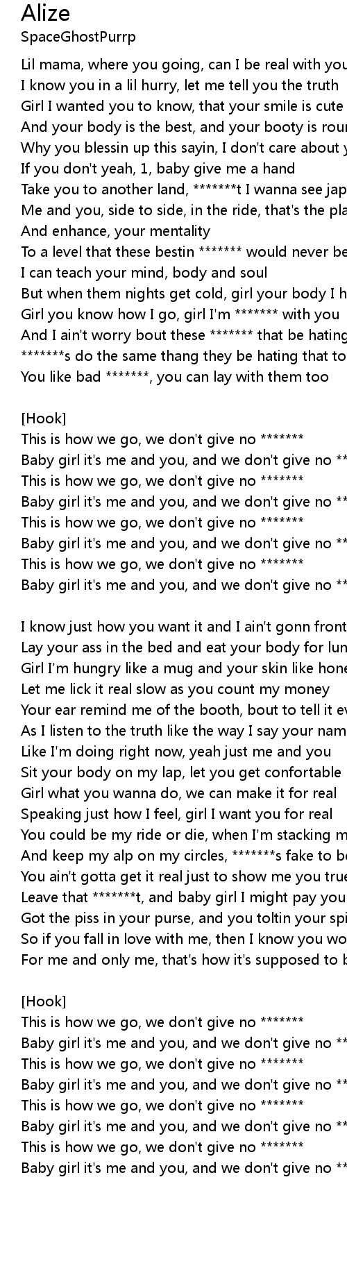 Baby girl it's me and you, and we don't give no *******s.