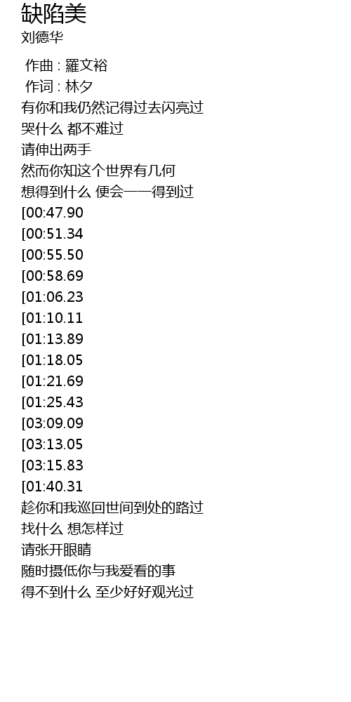 | [03:01.28][01:21.69] | 只因有缺陷美 开心短暂亦回味 |