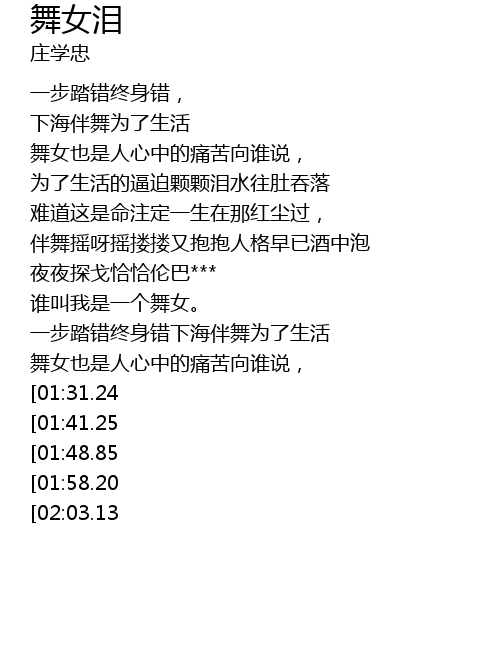| [01:15.39] | 一步踏错终身错下海伴舞为了生活 |