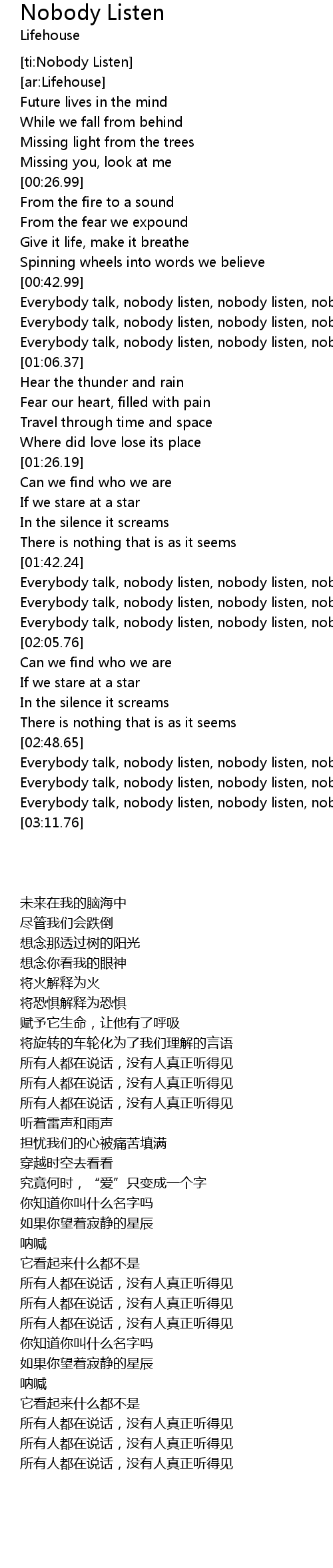 | [00:45.43] | Everybody talk, nobody listen, nobody listen, nobody listen |