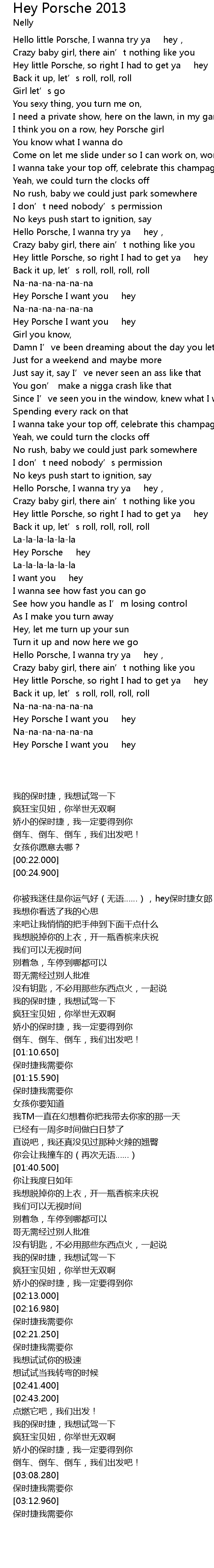| [03:14.990] | Hey Porsche I want you hey |