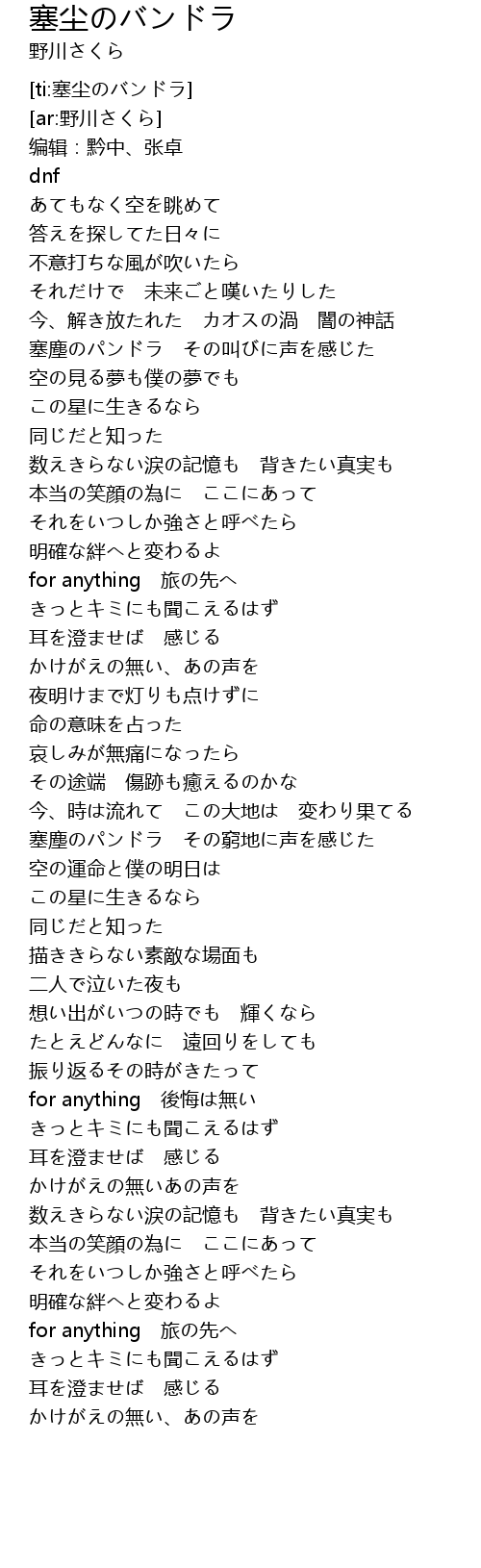 | [00:46.183] | 塞塵のパンドラ その叫びに声を感じた |