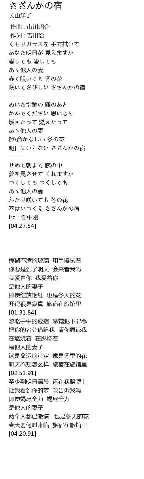 | [04:00.61] | 春はいつくる さざんかの宿 |
