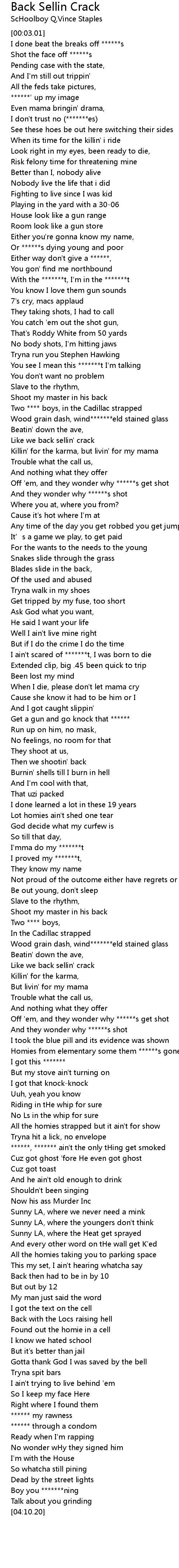 | [03:24.51] | ******, ******* ain't the only tHing get smoked |