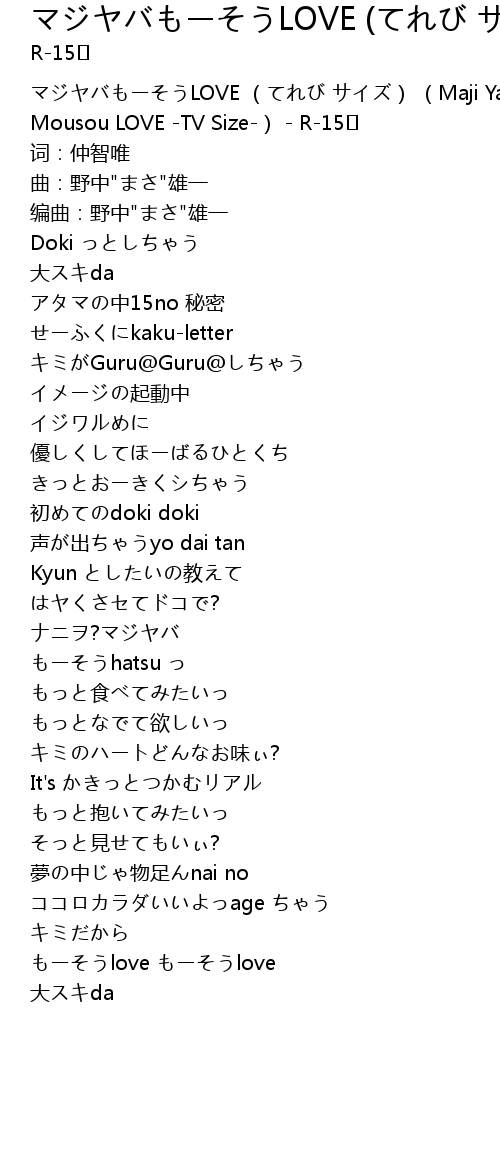 | [00:00.100] | マジヤバもーそうLOVE (てれび サイズ) (Maji Yaba Mousou LOVE -TV Size-) - R-15♡ |