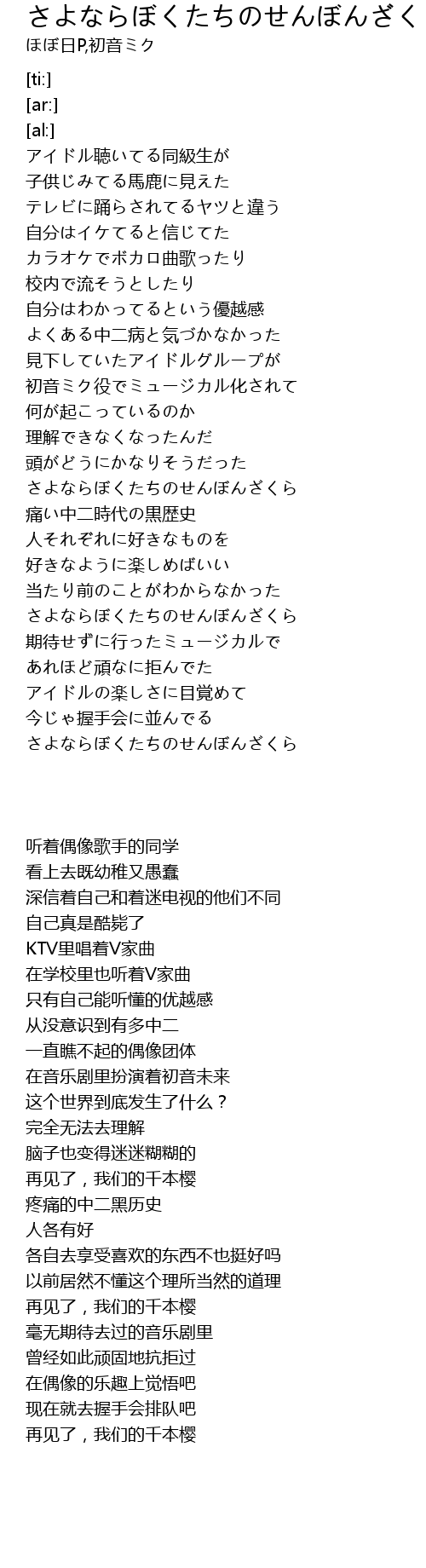 | [01:43.86] | さよならぼくたちのせんぼんざくら |