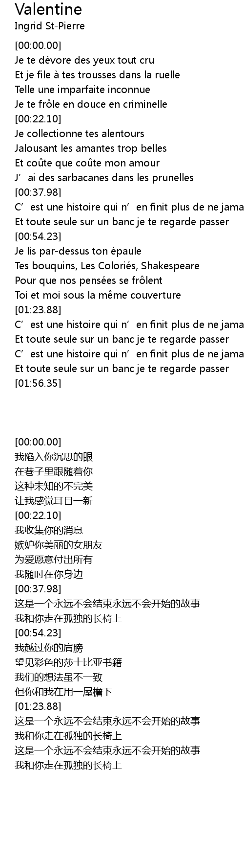 | [01:24.91] | C' est une histoire qui n' en finit plus de ne jamais commencer |