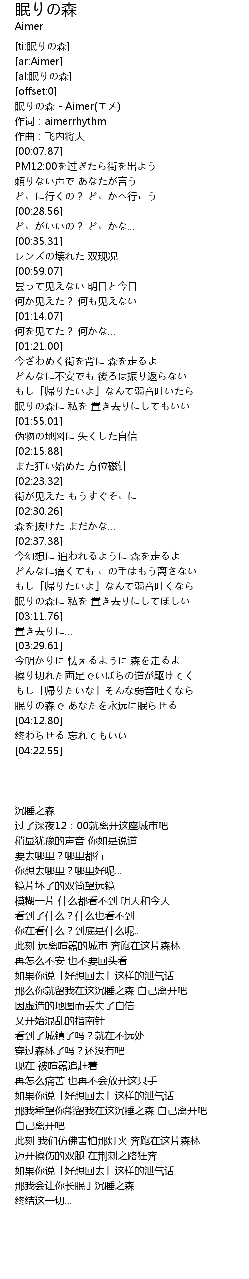 | [00:00.88] | 眠りの森 - Aimer(エメ) |