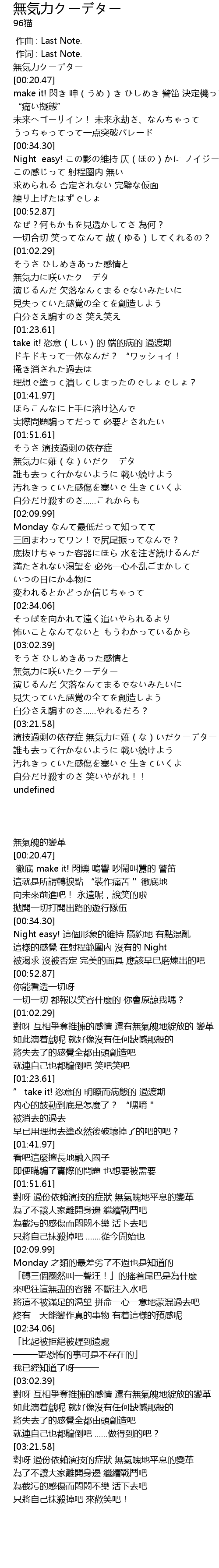 | [00:41.84] | Night easy! この影の維持 仄(ほの)かに ノイジー この感じって 射程圏内 無い |