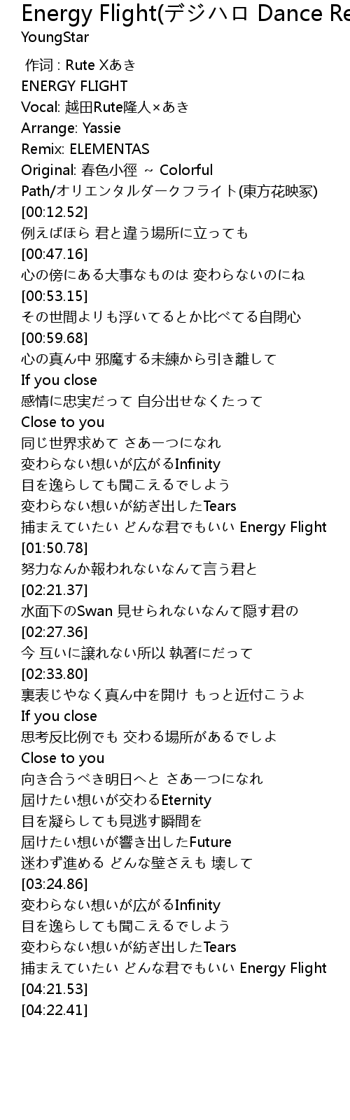 | [04:08.56] | 捕まえていたい どんな君でもいい Energy Flight |