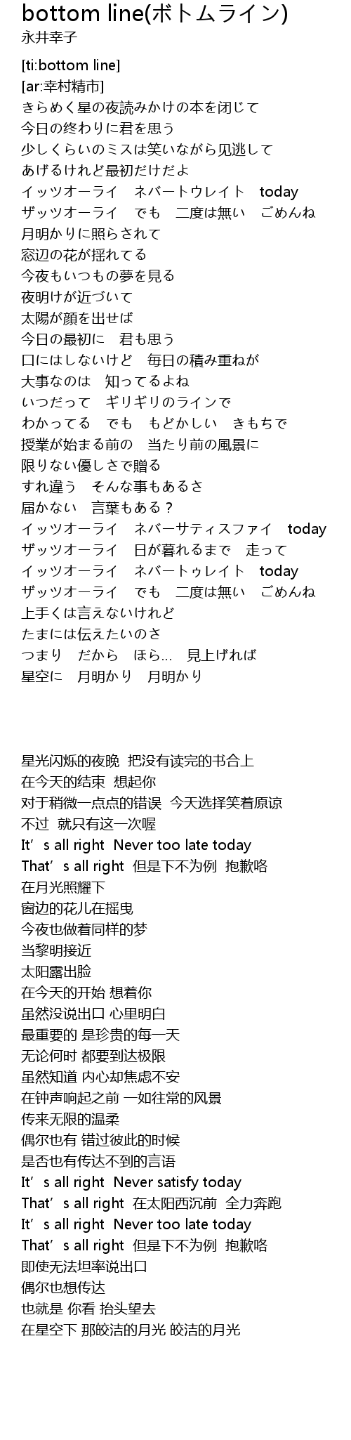 | [03:08.347] | イッツオーライ ネバートゥレイト today |